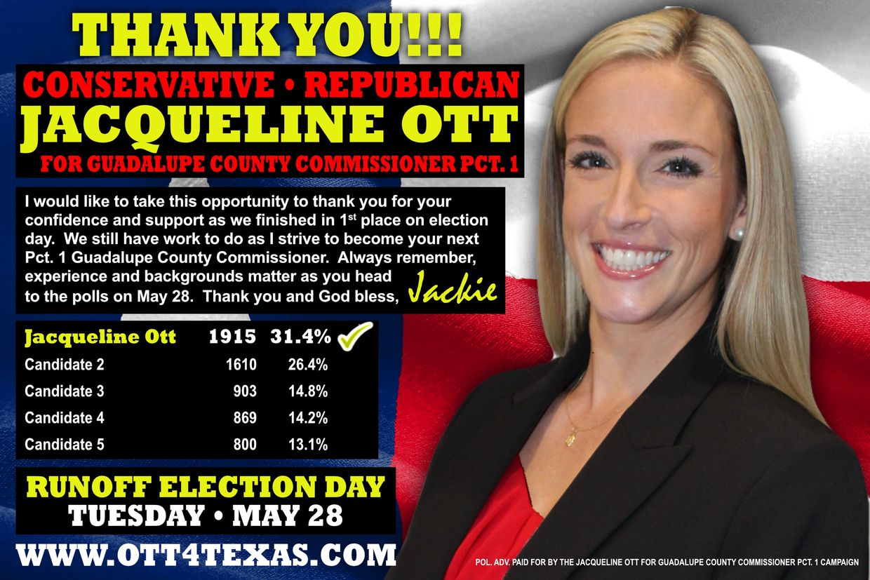 My name is Jacqueline Ott and I am asking for your support on March 5 in serving as your next Guadalupe County Commissioner for Precinct 1.